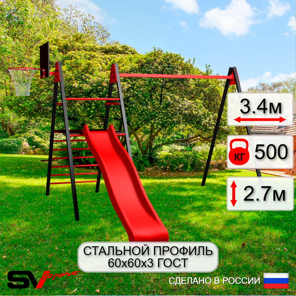 КОМПЛЕКТАЦИЯ: Каркас УК Sv Sport Maxi 3.4м, Щит баскетбольный Sv Sport c кронштейном к УК Sv Sport Maхi, Комплект горка Sv Sport Махi к уличным качелям.
