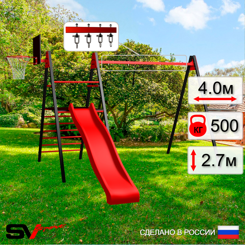 КОМПЛЕКТАЦИЯ: Каркас УК Sv Sport Maxi 4.0м, Щит баскетбольный Sv Sport c кронштейном к УК Sv Sport Maхi, Комплект горка Sv Sport Махi к уличным качелям, Подвесы для качелей на втулке Sv Sport 2 компл.