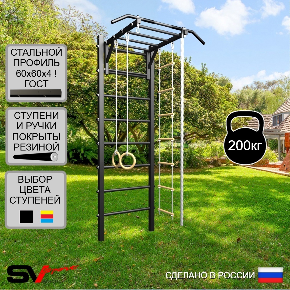 КОМПЛЕКТАЦИЯ: Уличная шведская стенка Sv Sport, Турник Sv Sport Рукоход к УШС, Комплект: канат с крепежом, кольца гимнастические деревянные, лестница веревочная.