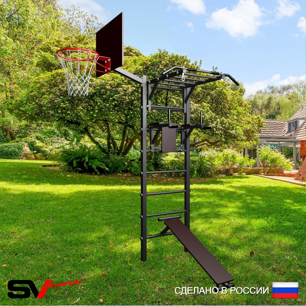 КОМПЛЕКТАЦИЯ: Уличная шведская стенка Sv Sport, Турник Sv Sport Рукоход к УШС, Брусья Sv Sport к УШС, Скамья для пресса и жима Sv Sport к УШС, Щит баскетбольный Sv Sport c кронштейном к УШС Sv Sport.