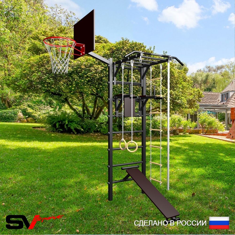 КОМПЛЕКТАЦИЯ: Уличная шведская стенка Sv Sport, Турник Sv Sport Рукоход к УШС, Брусья Sv Sport к УШС, Скамья для пресса и жима Sv Sport к УШС, Комплект: канат с крепежом, кольца гимнастические деревянные, лестница веревочная, Щит баскетбольный Sv Sport c кронштейном к УШС Sv Sport.