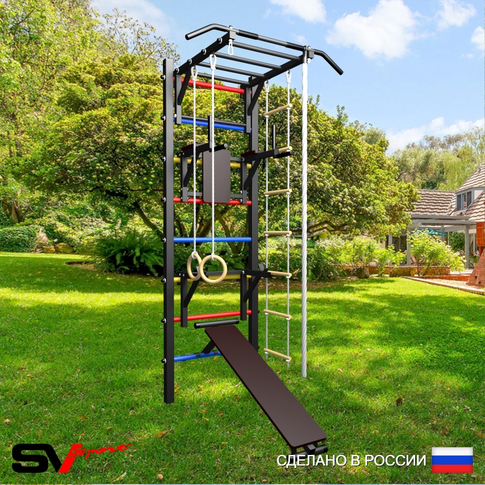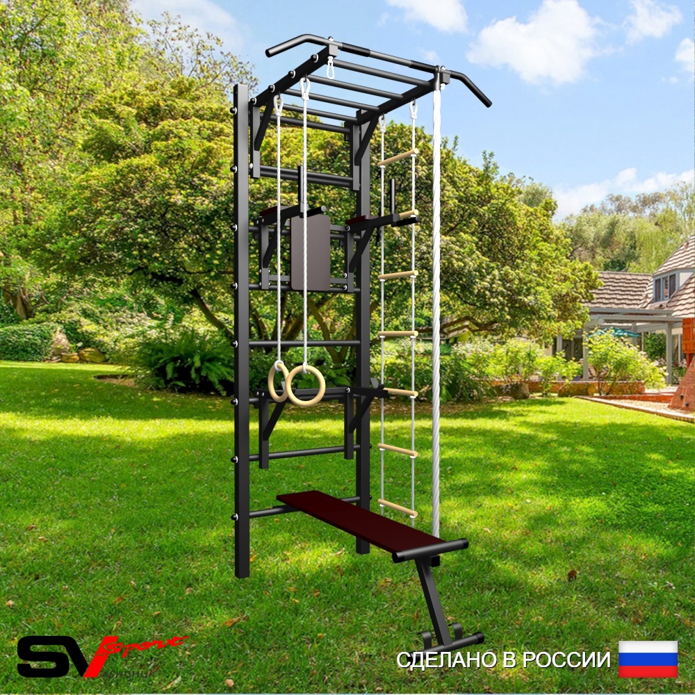 КОМПЛЕКТАЦИЯ: Уличная шведская стенка Sv Sport, Турник Sv Sport Рукоход к УШС, Брусья Sv Sport к УШС, Стойка под штангу Sv Sport к УШС, Скамья для пресса и жима Sv Sport к УШС, Комплект: канат с крепежом, кольца гимнастические деревянные, лестница веревочная.