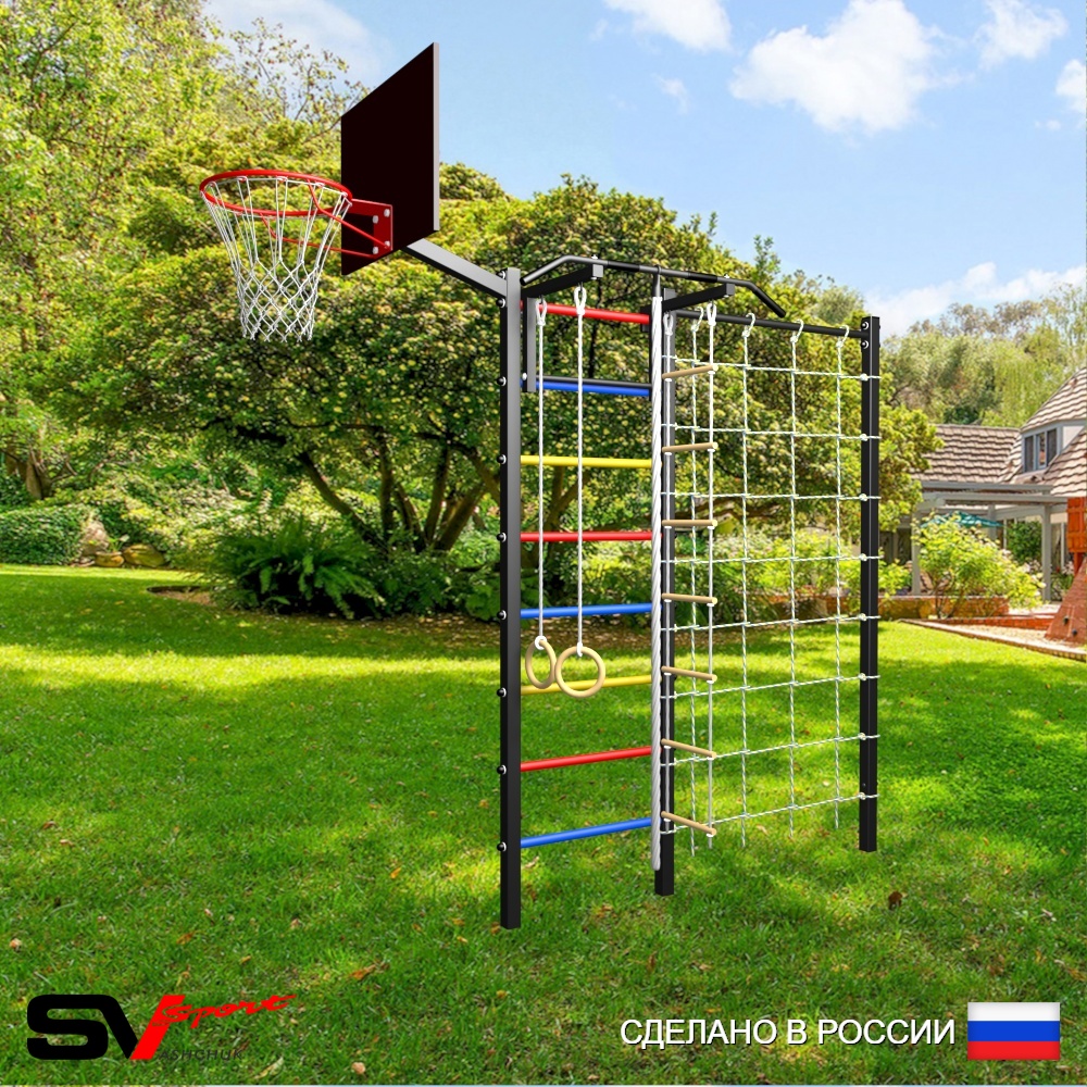 КОМПЛЕКТАЦИЯ: Уличная шведская стенка Sv Sport, Турник Sv Sport стандарт к УШС, Комплект: канат с крепежом, кольца гимнастические деревянные, лестница веревочная, Щит баскетбольный Sv Sport c кронштейном к УШС Sv Sport, Сетка к спортивному комплексу, Комплект турник прямой.