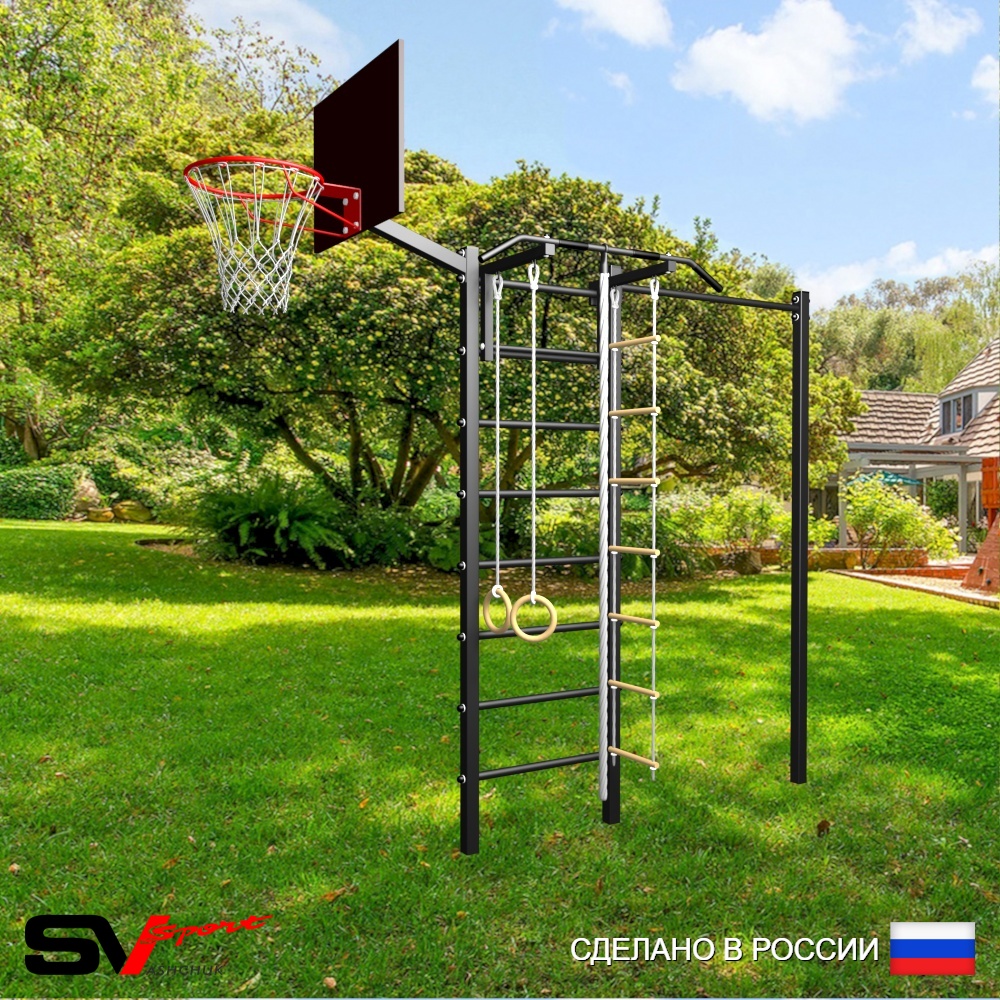 КОМПЛЕКТАЦИЯ: Уличная шведская стенка Sv Sport, Турник Sv Sport стандарт к УШС, Комплект: канат с крепежом, кольца гимнастические деревянные, лестница веревочная, Щит баскетбольный Sv Sport c кронштейном к УШС Sv Sport, Комплект турник прямой.