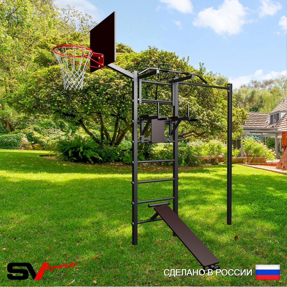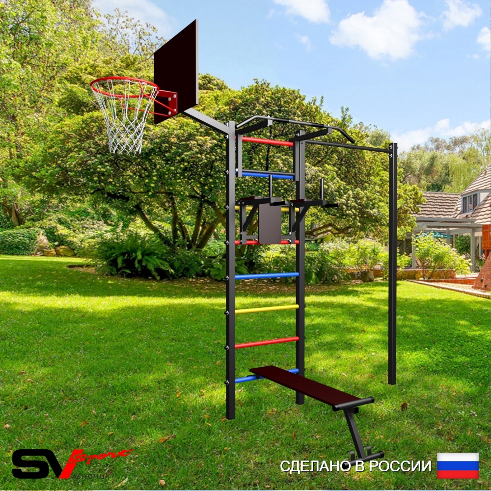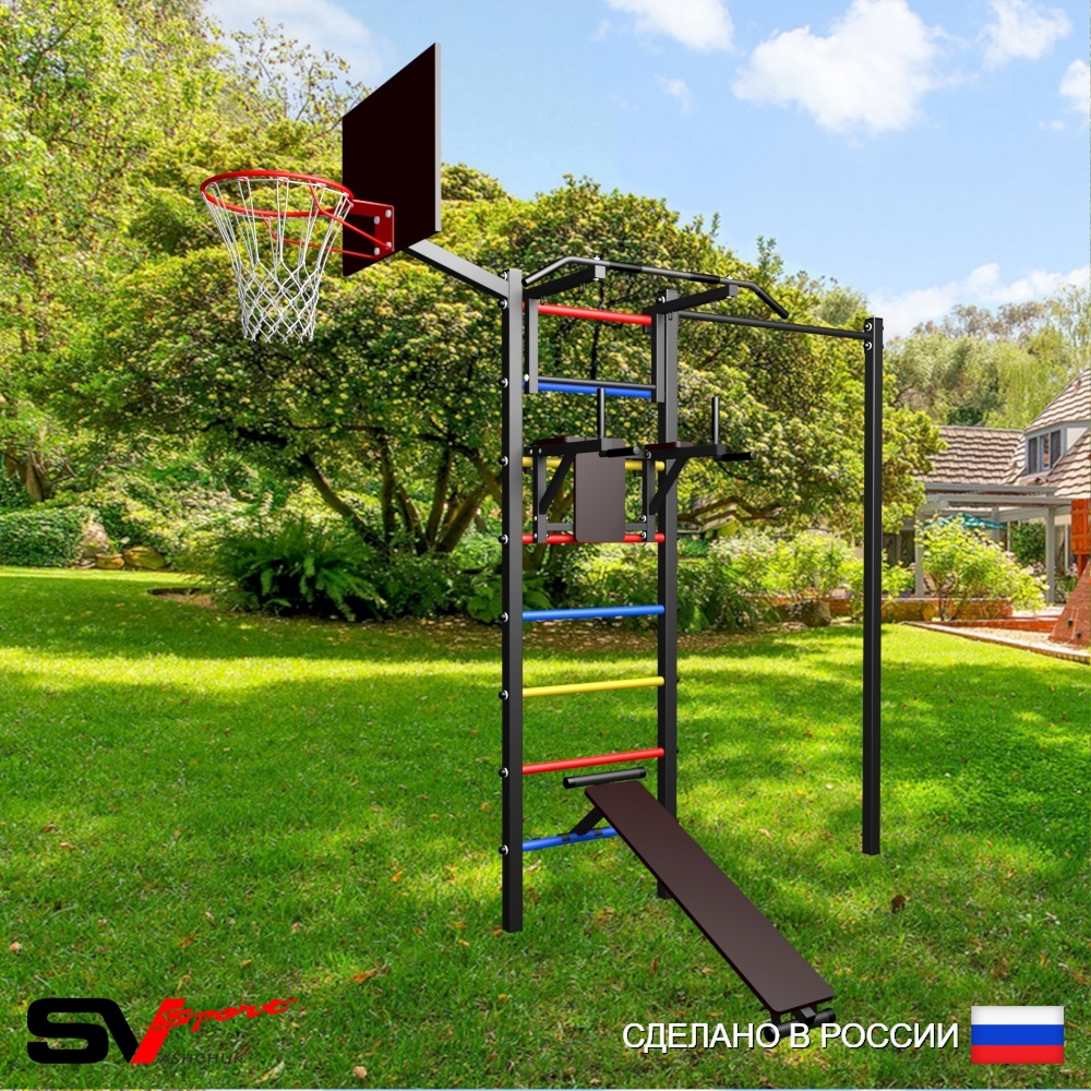 КОМПЛЕКТАЦИЯ: Уличная шведская стенка Sv Sport, Турник Sv Sport стандарт к УШС, Брусья Sv Sport к УШС, Скамья для пресса и жима Sv Sport к УШС, Щит баскетбольный Sv Sport c кронштейном к УШС Sv Sport, Комплект турник прямой.