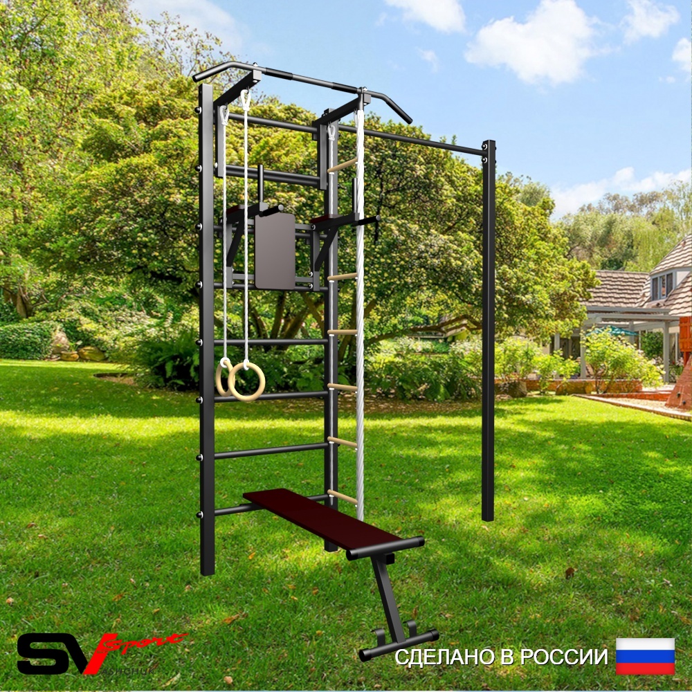 КОМПЛЕКТАЦИЯ: Уличная шведская стенка Sv Sport, Турник Sv Sport стандарт к УШС, Брусья Sv Sport к УШС, Скамья для пресса и жима Sv Sport к УШС, Комплект: канат с крепежом, кольца гимнастические деревянные, лестница веревочная, Комплект турник прямой.
