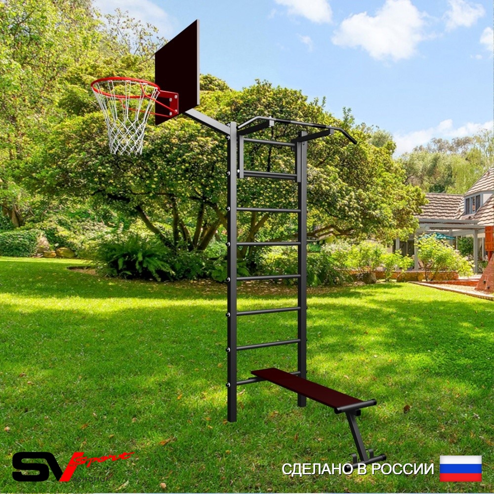 КОМПЛЕКТАЦИЯ: Уличная шведская стенка Sv Sport, Турник Sv Sport стандарт к УШС, Скамья для пресса и жима Sv Sport к УШС, Щит баскетбольный Sv Sport c кронштейном к УШС Sv Sport.