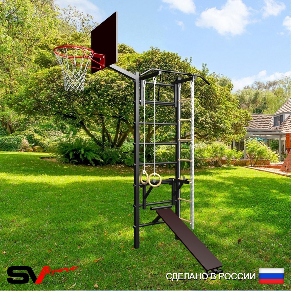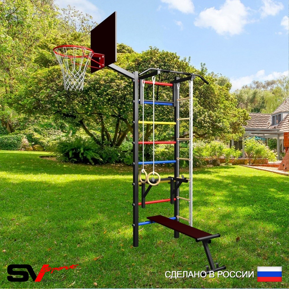 КОМПЛЕКТАЦИЯ: Уличная шведская стенка Sv Sport, Турник Sv Sport стандарт к УШС, Стойка под штангу Sv Sport к УШС, Скамья для пресса и жима Sv Sport к УШС, Комплект: канат с крепежом, кольца гимнастические деревянные, лестница веревочная, Щит баскетбольный Sv Sport c кронштейном к УШС Sv Sport.