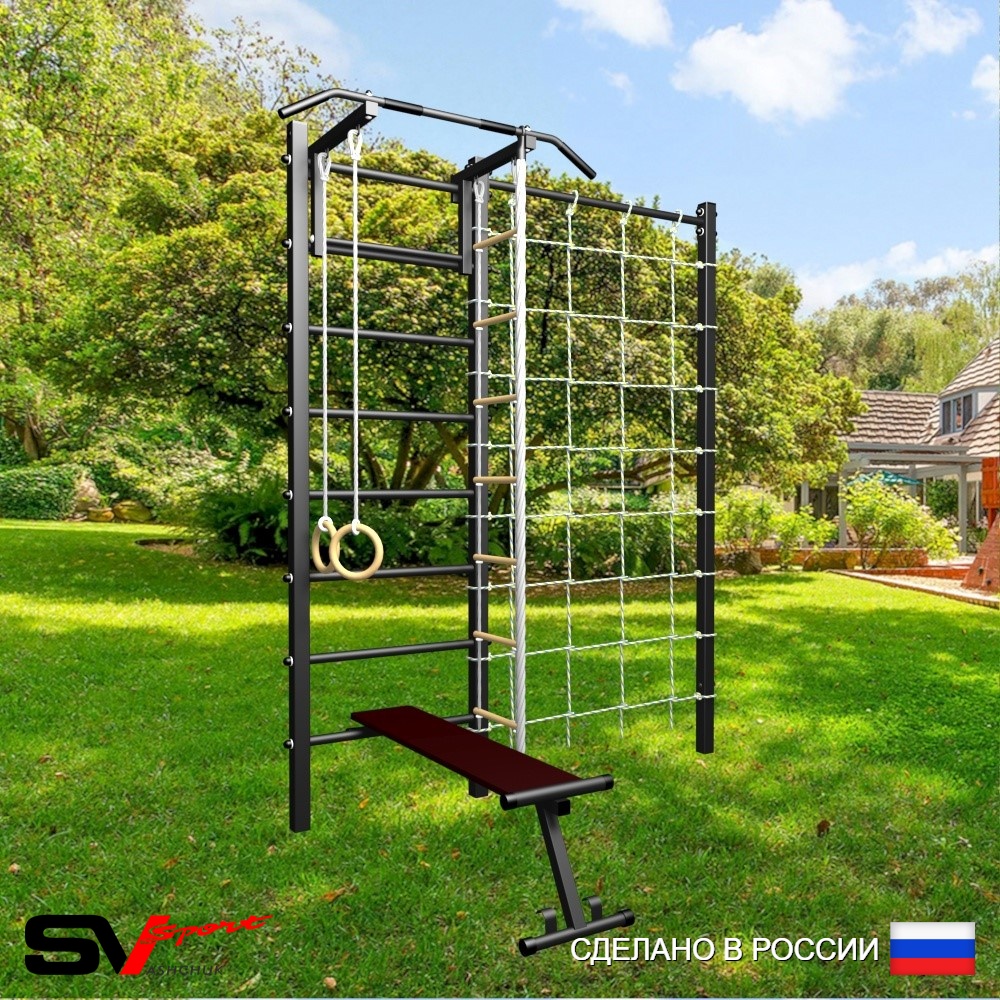 КОМПЛЕКТАЦИЯ: Уличная шведская стенка Sv Sport, Турник Sv Sport стандарт к УШС, Скамья для пресса и жима Sv Sport к УШС, Комплект: канат с крепежом, кольца гимнастические деревянные, лестница веревочная, Сетка к спортивному комплексу, Комплект турник прямой.