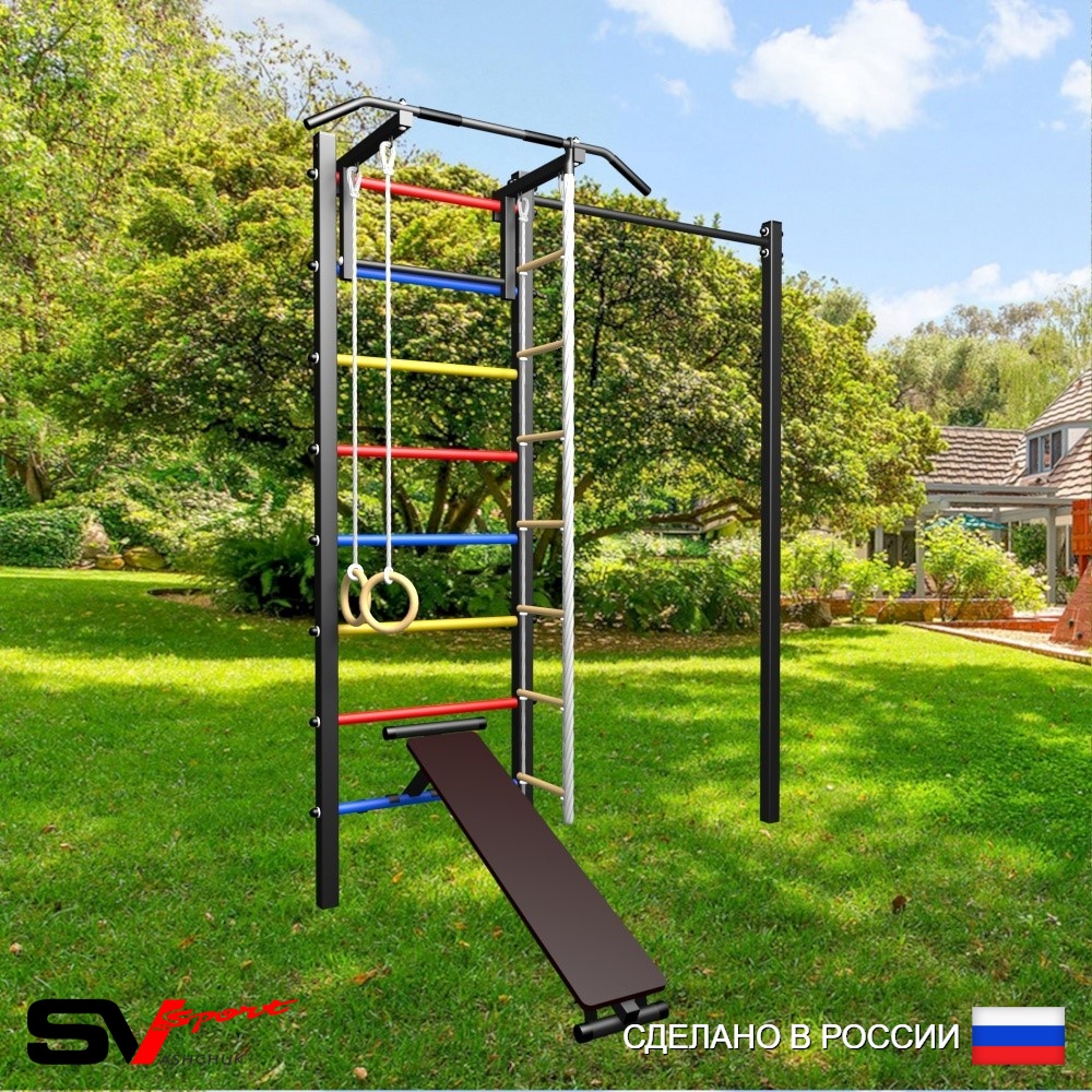 КОМПЛЕКТАЦИЯ: Уличная шведская стенка Sv Sport, Турник Sv Sport стандарт к УШС, Скамья для пресса и жима Sv Sport к УШС, Комплект: канат с крепежом, кольца гимнастические деревянные, лестница веревочная, Комплект турник прямой.