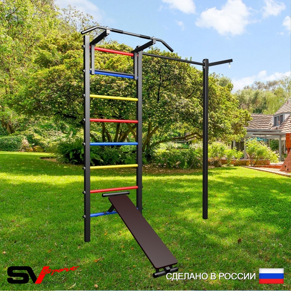 КОМПЛЕКТАЦИЯ: Уличная шведская стенка Sv Sport, Турник Sv Sport стандарт к УШС, Скамья для пресса и жима Sv Sport к УШС, Кронштейн для подвеса боксерского мешка, Комплект турник прямой.