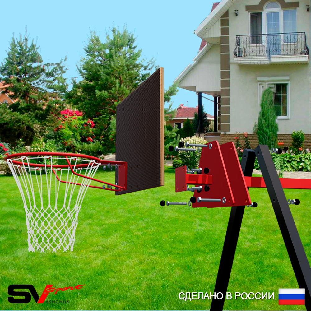 Щит баскетбольный устанавливается при помощи специального кронштейна, который идет в комплекте. Кронштейн крепится непосредственно к уличным качелями Sv Sport. Это обеспечивает надежность установки и безопасность использования во время игры. Корзина баскетбольная также включена в комплект поставки и имеет диаметр обода 450 мм. Она оснащена сеткой, которая позволяет легко определить попадание мяча в цель. Щит баскетбольный изготовлен из высококачественной ламинированной, березовой фанеры, покрытой специальным материалом, пропитанной смолами, которая в процессе производства приобретает свойства защитной пленки. Характеризуется высокой износостойкостью, сопротивляемостью воздействия агрессивных сред, прочностью, твердостью поверхности, повышенной влагостойкостью, защитой от скольжения, устойчивостью к перепадам температуры от -40 до +40.