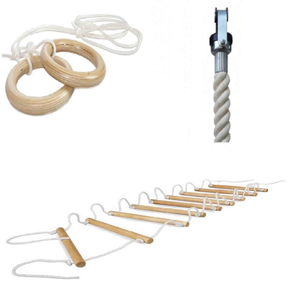 КОМПЛЕКТАЦИЯ: Канат х/б с крепежом, Кольца гимнастические деревянные (2 шт), Лестница веревочная с деревянными ступенями (10 шт).