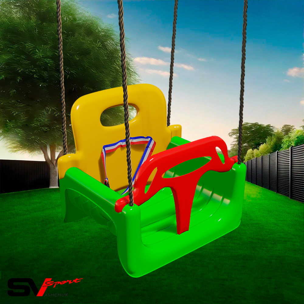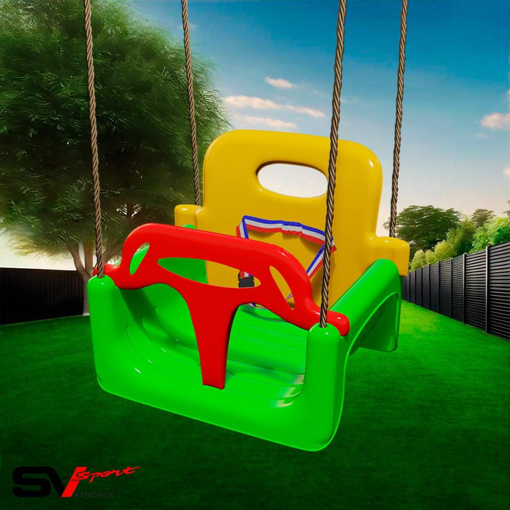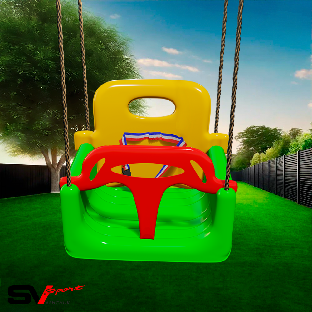 Чтобы Вам не пришлось приобретать новую модель качелей через каждые 2-3 года, вы можете приобрести качели 3 в 1. Вы можете снять все детали и оставить только сиденье. Такой вариант подойдет для детей, что постарше. Дальше на конструкции можно закрепить заднюю спинку и передний блок для страховки маленьких детей. Кроме пластмассовых частей в модели предусмотрены ленты, которые полностью исключают любой травматизм для ребенка.