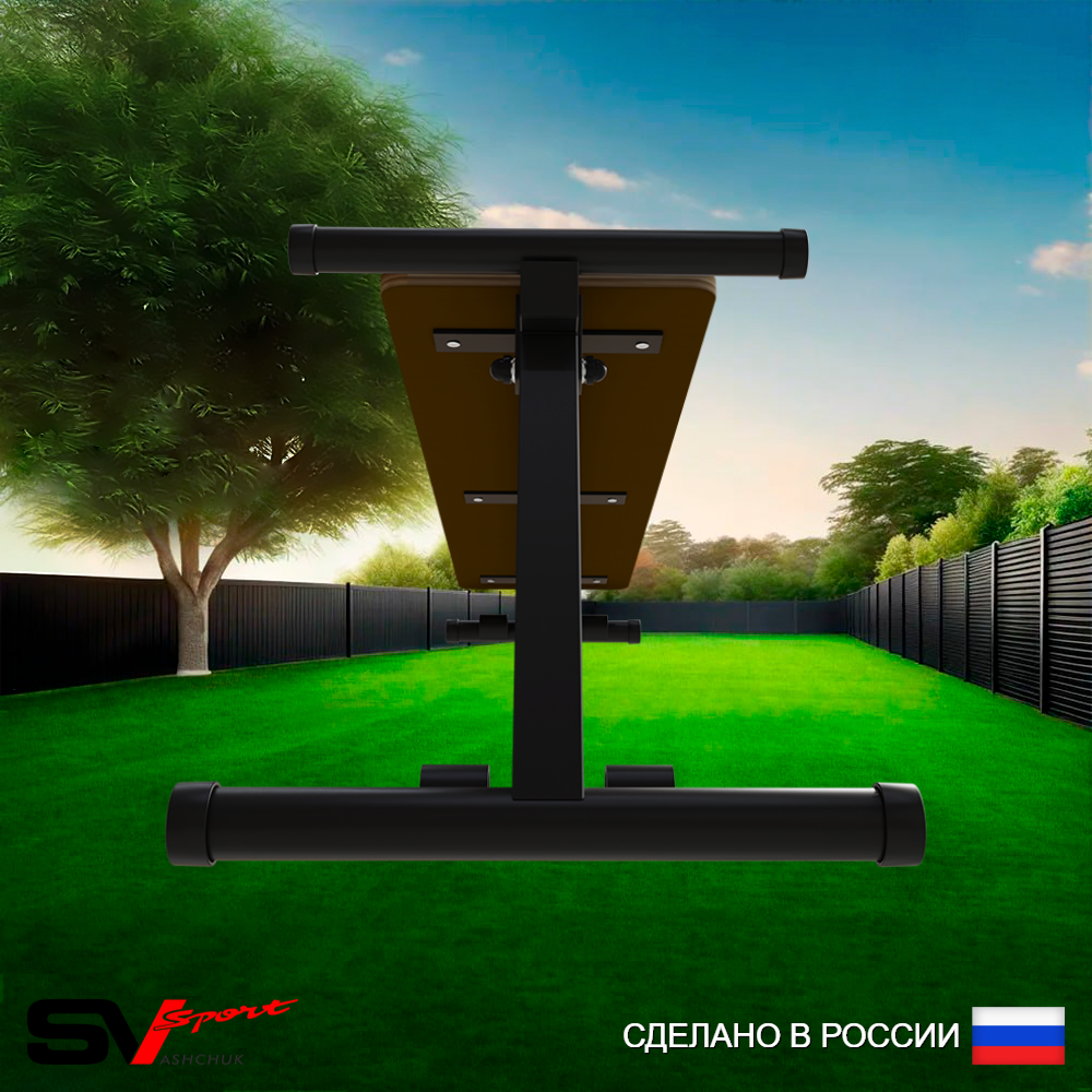 Скамья для пресса и жима Sv Sport к уличной шведской стенке изготовлена из профильной трубы 40 х 40 мм, толщиной от 2 до 4 мм, круглой трубы D42 мм, толщиной 3,2 мм. Лежак изготовлен из высококачественной ламинированной, березовой фанеры, покрытой специальным материалом, пропитанной смолами, которая в процессе производства приобретает свойства защитной пленки. Характеризуется высокой износостойкостью, сопротивляемостью воздействия агрессивных сред, прочностью, твердостью поверхности, повышенной влагостойкостью, защитой от скольжения, устойчивостью к перепадам температуры от -40 до +40°С. Окрашены качественной, импортной порошковой краской в 2 этапа, устойчивой к коррозии, истиранию и температурным перепадам. Все торцы, болты, гайки заглушены пластиковыми заглушками.