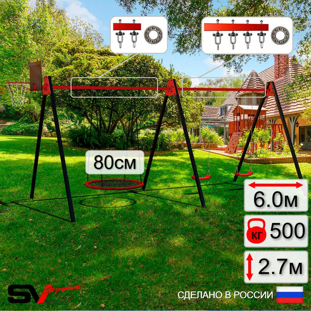 КОМПЛЕКТАЦИЯ: Каркас УК Sv Sport Maxi 6.0м, Щит баскетбольный Sv Sport c кронштейном к УК Sv Sport Maхi, Качели - гнездо 80см, Качели пластиковые "Лодочка" 2шт, Подвесы для качелей на подшипниках Sv Sport 3 компл.