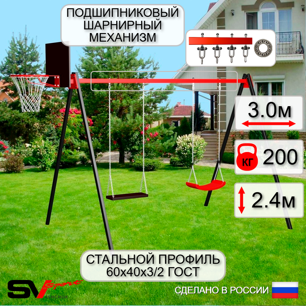 КОМПЛЕКТАЦИЯ: Каркас УК Sv Sport 3.0м, Щит баскетбольный Sv Sport c кронштейном к УК Sv Sport, Качели пластиковые "Лодочка", Качели деревянные на цепях Sv Sport, Подвесы для качелей на подшипниках Sv Sport 2 компл.