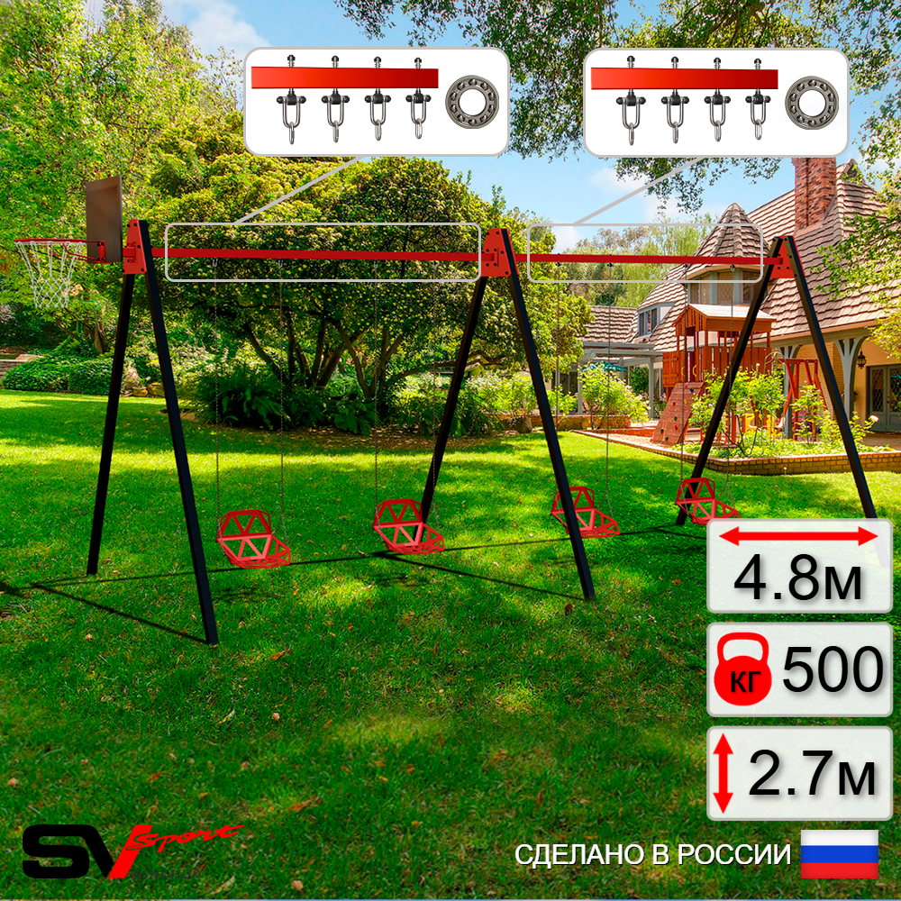 КОМПЛЕКТАЦИЯ: Каркас УК Sv Sport Maxi 4.8м, Щит баскетбольный Sv Sport c кронштейном к УК Sv Sport Maхi, Качели пластиковые со спинкой на цепях 4шт, Подвесы для качелей на подшипниках Sv Sport 4 компл.