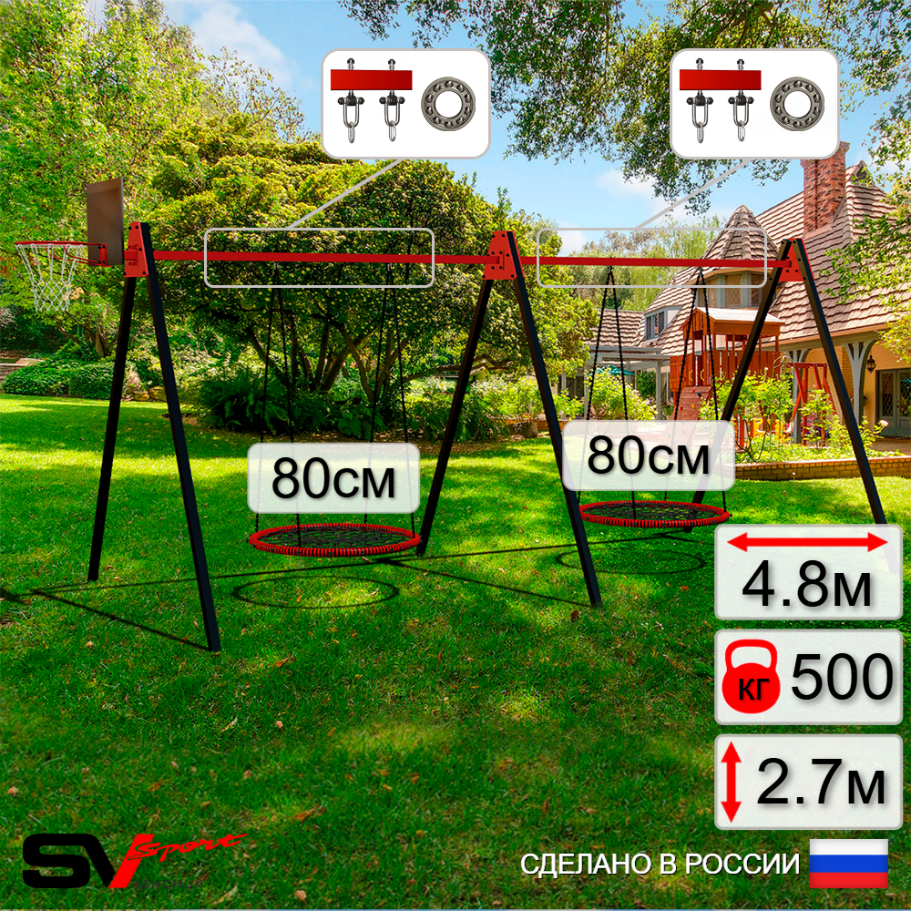 КОМПЛЕКТАЦИЯ: Каркас УК Sv Sport Maxi 4.8м, Щит баскетбольный Sv Sport c кронштейном к УК Sv Sport Maхi, Качели - гнездо 80см 2шт, Подвесы для качелей на подшипниках Sv Sport 2 компл.