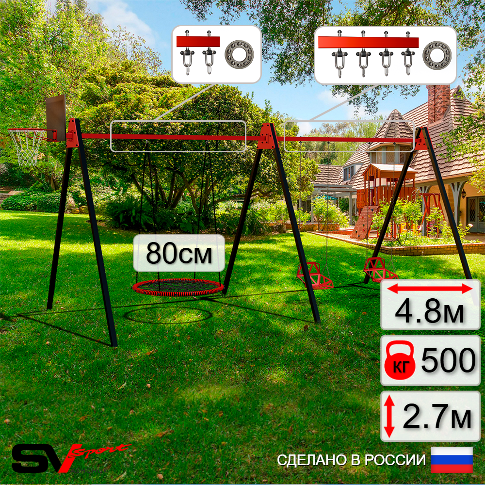 КОМПЛЕКТАЦИЯ: Каркас УК Sv Sport Maxi 4.8м, Щит баскетбольный Sv Sport c кронштейном к УК Sv Sport Maхi, Качели - гнездо 80см, Качели пластиковые со спинкой на цепях 2шт, Подвесы для качелей на подшипниках Sv Sport 3 компл.
