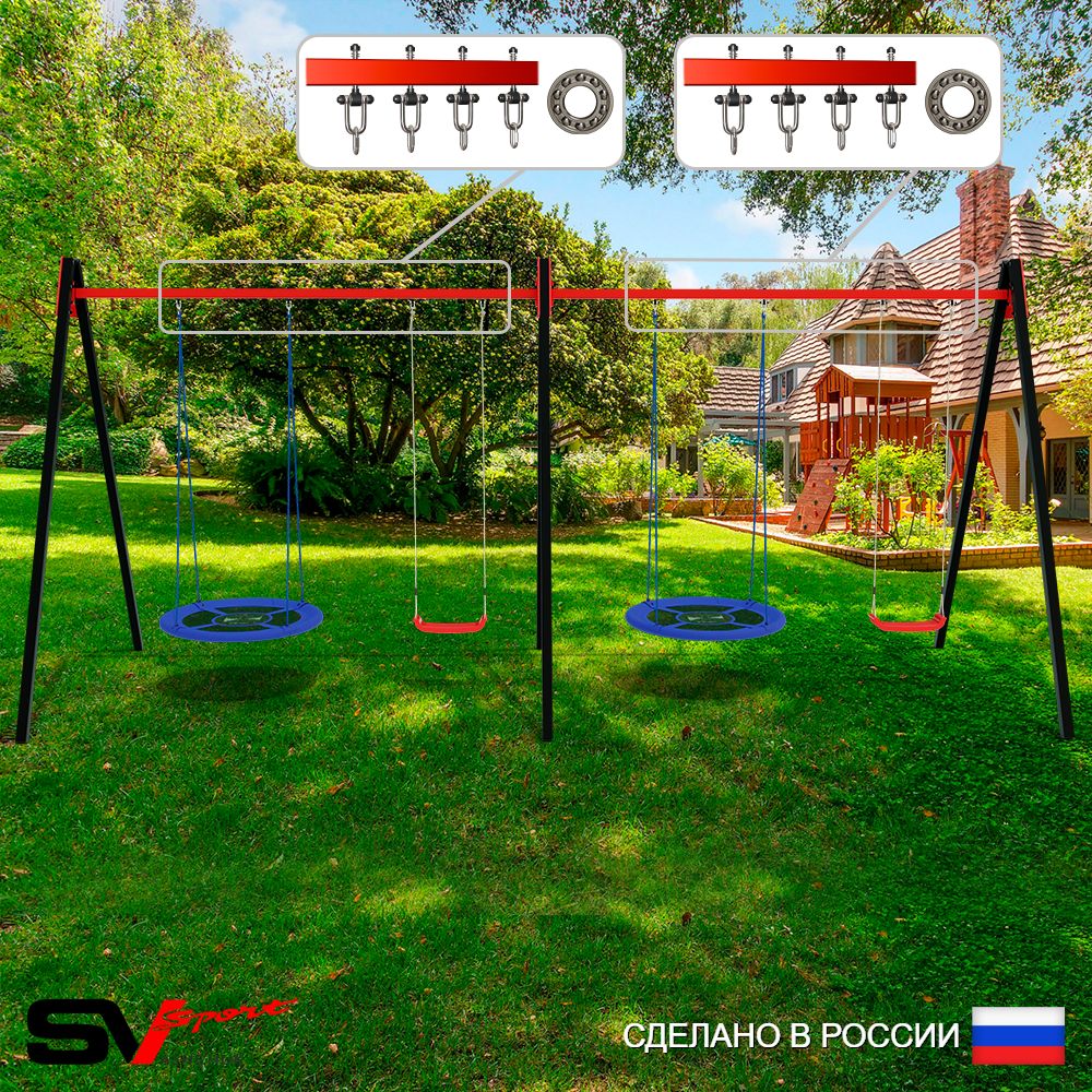 КОМПЛЕКТАЦИЯ: Каркас УК Sv Sport Maxi 4.8м, Качели - гнездо Оксф. 100см 2шт, Качели пластиковые "Лодочка" 2шт, Подвесы для качелей на подшипниках Sv Sport 4 компл.