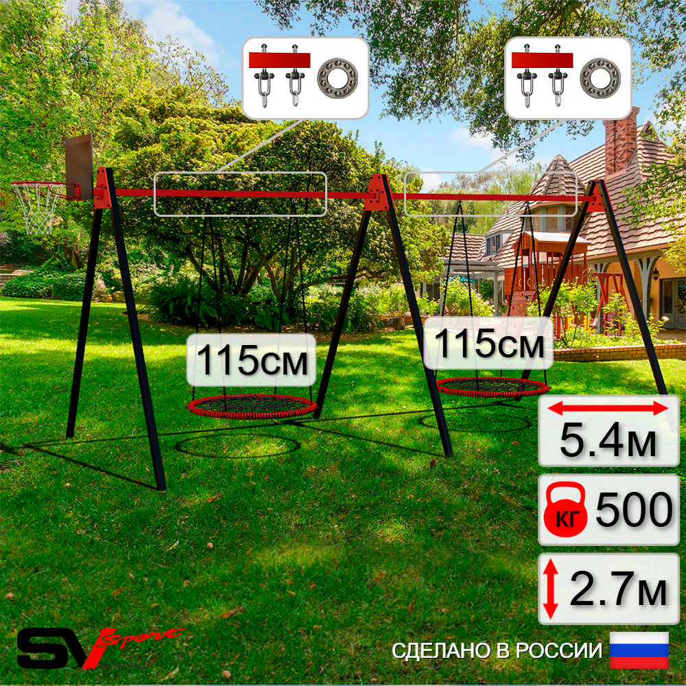 КОМПЛЕКТАЦИЯ: Каркас УК Sv Sport Maxi 5.4м, Щит баскетбольный Sv Sport c кронштейном к УК Sv Sport Maхi, Качели - гнездо 115см 2шт, Подвесы для качелей на подшипниках Sv Sport 2 компл.