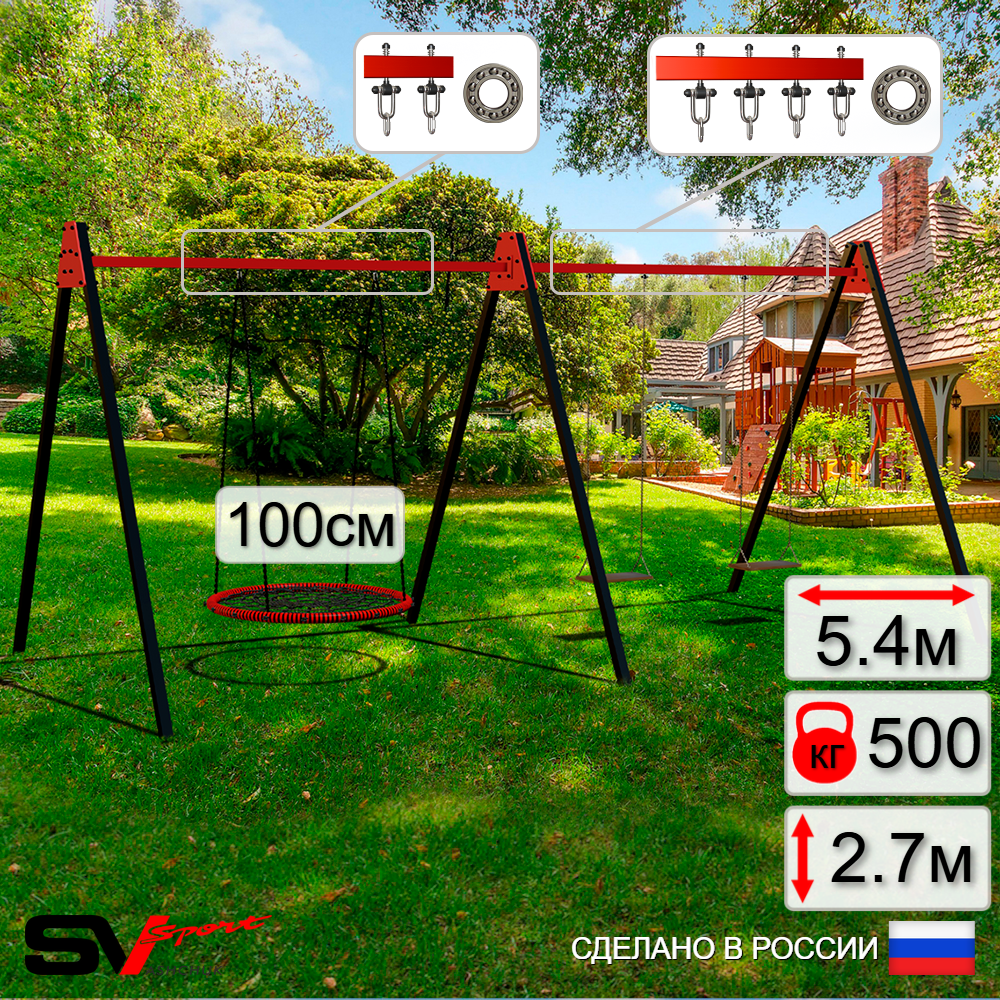 КОМПЛЕКТАЦИЯ: Каркас УК Sv Sport Maxi 5.4м, Качели - гнездо 100см, Качели деревянные на цепях Sv Sport 2шт, Подвесы для качелей на подшипниках Sv Sport 3 компл.