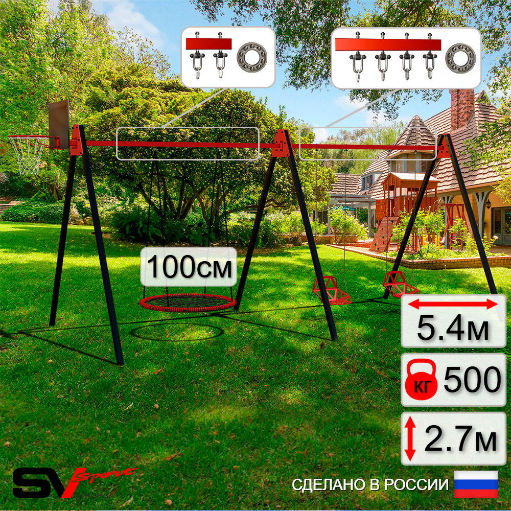 КОМПЛЕКТАЦИЯ: Каркас УК Sv Sport Maxi 5.4м, Щит баскетбольный Sv Sport c кронштейном к УК Sv Sport Maхi, Качели - гнездо 100см, Качели пластиковые со спинкой на цепях 2шт, Подвесы для качелей на подшипниках Sv Sport 3 компл.