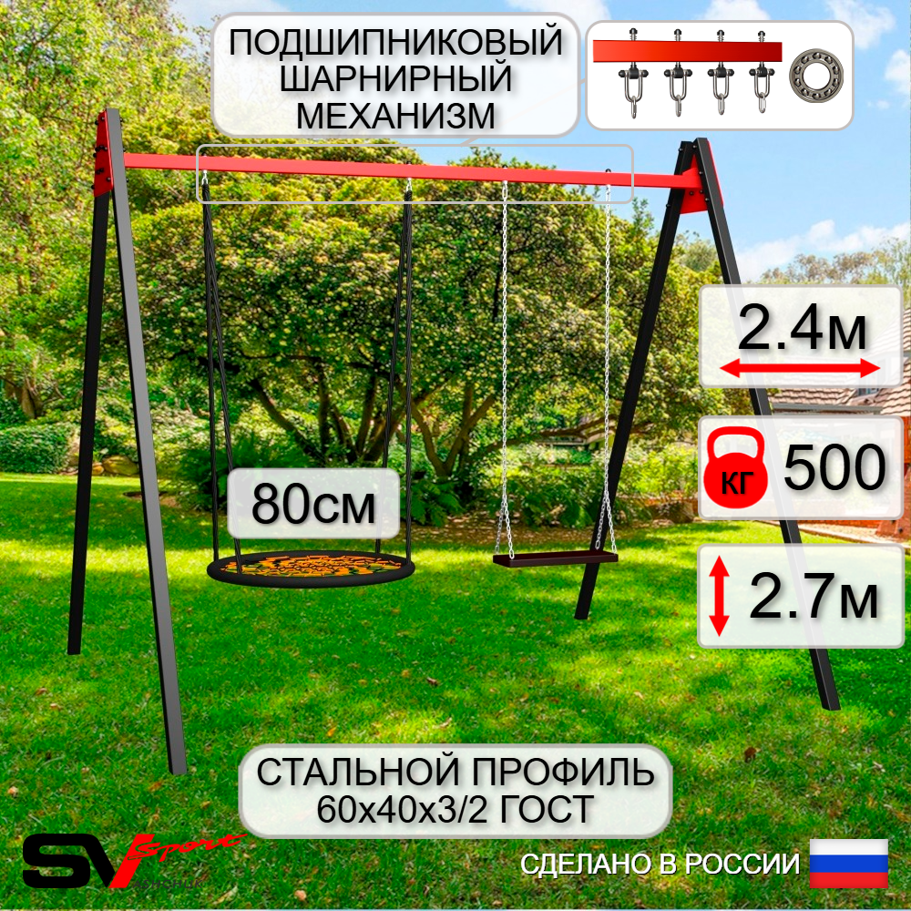 КОМПЛЕКТАЦИЯ: Каркас УК Sv Sport Maxi 2.4м, Качели - гнездо 80см, Качели деревянные на цепях Sv Sport, Подвесы для качелей на подшипниках Sv Sport 2 компл.