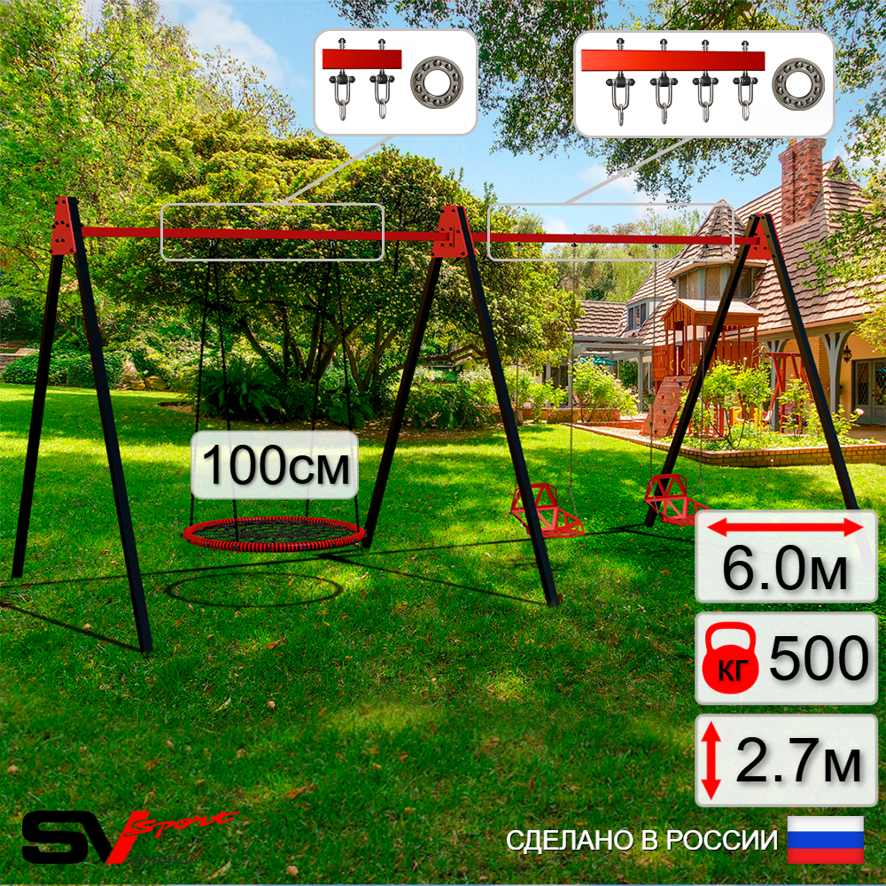 КОМПЛЕКТАЦИЯ: Каркас УК Sv Sport Maxi 6.0м, Качели - гнездо 100см, Качели пластиковые со спинкой на цепях 2шт, Подвесы для качелей на подшипниках Sv Sport 3 компл.