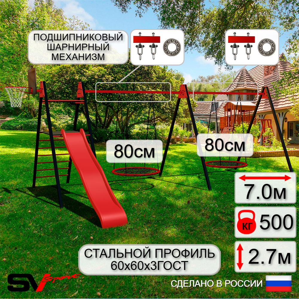 КОМПЛЕКТАЦИЯ: Каркас УК Sv Sport Maxi 7.0м, Щит баскетбольный Sv Sport c кронштейном к УК Sv Sport Maхi, Качели - гнездо 80см 2шт, Комплект горка Sv Sport Махi к уличным качелям, Подвесы для качелей на подшипниках Sv Sport 2 компл.