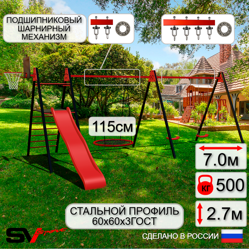 КОМПЛЕКТАЦИЯ: Каркас УК Sv Sport Maxi 7.0м, Щит баскетбольный Sv Sport c кронштейном к УК Sv Sport Maхi, Качели - гнездо 115см, Качели пластиковые "Лодочка" 2шт, Комплект горка Sv Sport Махi к уличным качелям, Подвесы для качелей на подшипниках Sv Sport 3 компл.