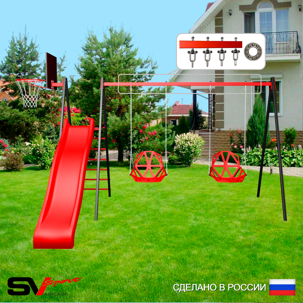 КОМПЛЕКТАЦИЯ: Каркас УК Sv Sport 3.7м, Щит баскетбольный Sv Sport c кронштейном к УК Sv Sport, Качели пластиковые со спинкой на цепях 2шт, Комплект горка Sv Sport к уличным качелям, Подвесы для качелей на подшипниках Sv Sport 2 компл.