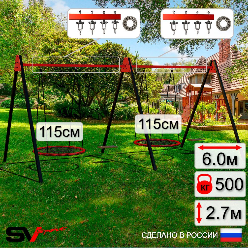 КОМПЛЕКТАЦИЯ: Каркас УК Sv Sport Maxi 6.0м, Качели - гнездо 115см 2шт, Качели деревянные на цепях Sv Sport 2шт, Подвесы для качелей на подшипниках Sv Sport 4 компл.