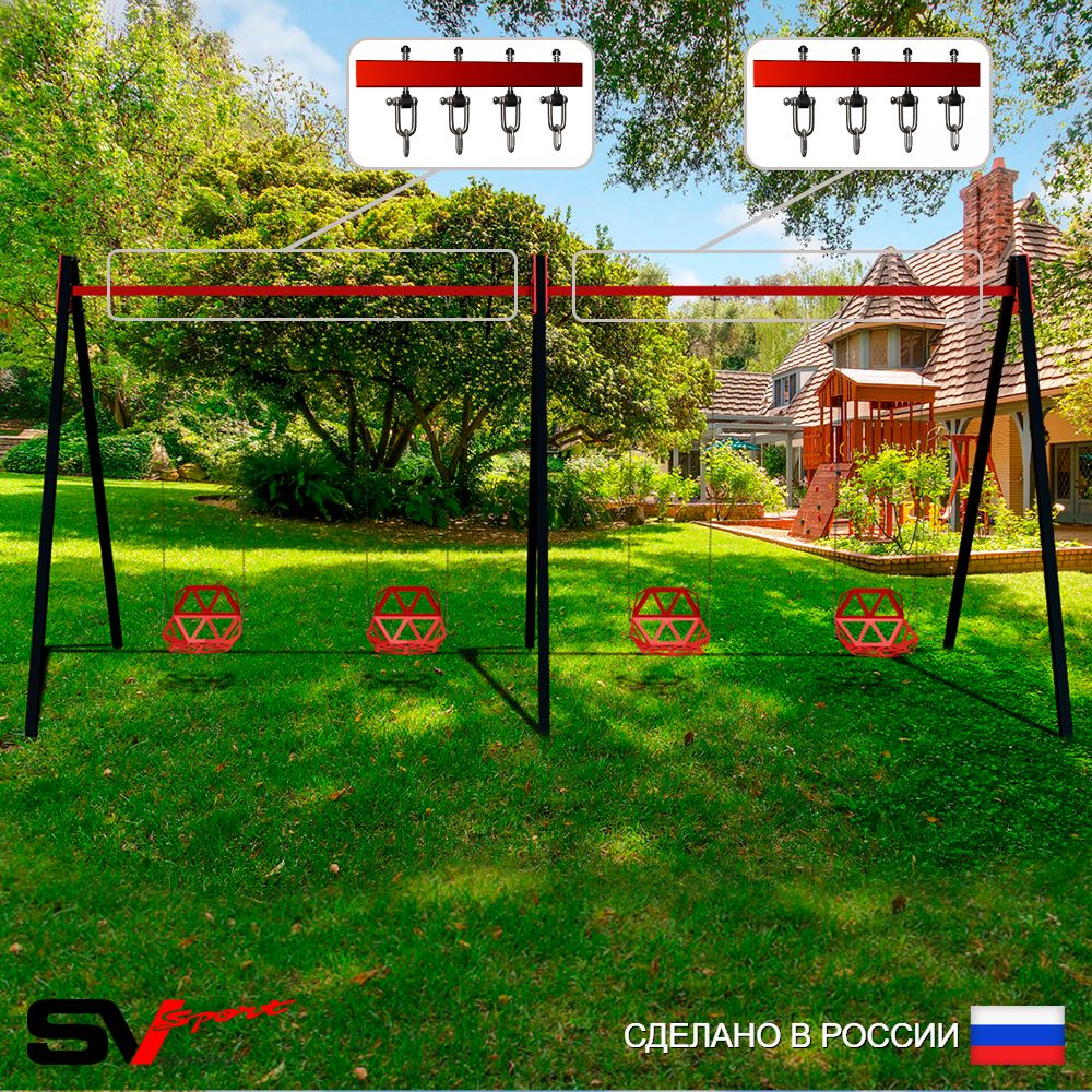 КОМПЛЕКТАЦИЯ: Каркас УК Sv Sport Maxi 4.8м, Качели пластиковые со спинкой на цепях 4шт, Подвесы для качелей на втулке Sv Sport 4 компл.