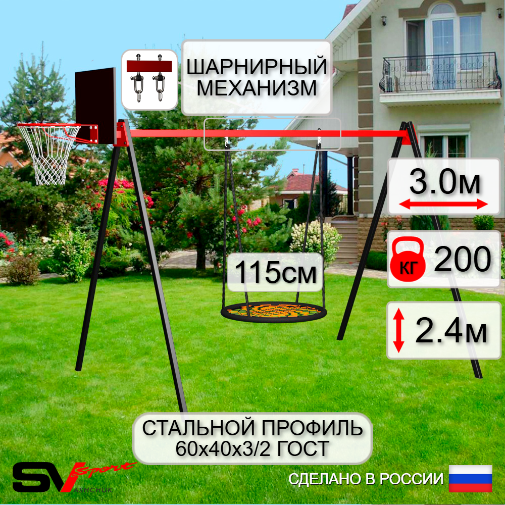 КОМПЛЕКТАЦИЯ: Каркас УК Sv Sport 3.0м, Щит баскетбольный Sv Sport c кронштейном к УК Sv Sport, Качели - гнездо 115см, Подвесы для качелей на втулке Sv Sport 1 компл.