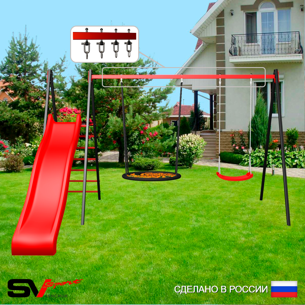 КОМПЛЕКТАЦИЯ: Каркас УК Sv Sport 3.7м, Качели - гнездо 115см, Качели пластиковые "Лодочка", Комплект горка Sv Sport к уличным качелям, Подвесы для качелей на втулке Sv Sport 2 компл.