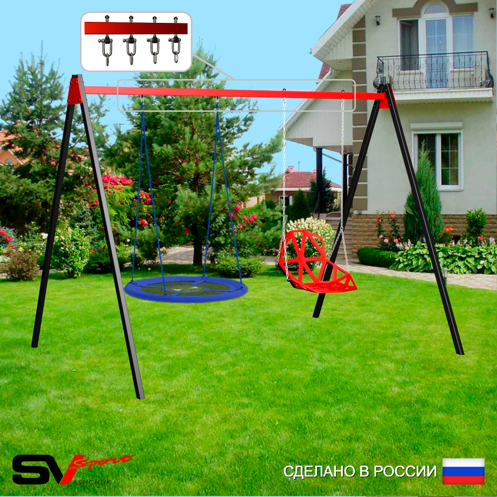 КОМПЛЕКТАЦИЯ: Каркас УК Sv Sport 3.0м, Качели - гнездо Оксф. 100см, Качели пластиковые со спинкой на цепях, Подвесы для качелей на втулке Sv Sport 2 компл.