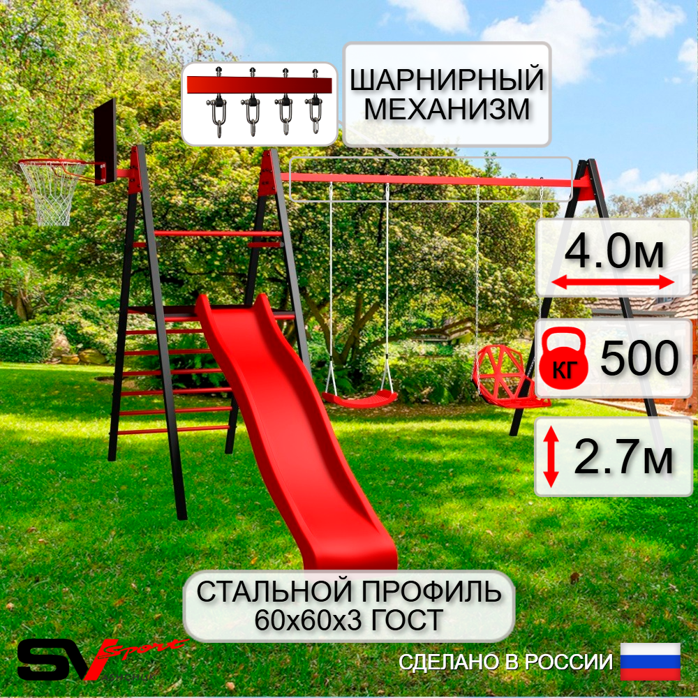 КОМПЛЕКТАЦИЯ: Каркас УК Sv Sport Maxi 4.0м, Щит баскетбольный Sv Sport c кронштейном к УК Sv Sport Maхi, Качели пластиковые "Лодочка", Качели пластиковые со спинкой на цепях, Комплект горка Sv Sport Махi к уличным качелям, Подвесы для качелей на втулке Sv Sport 2 компл.
