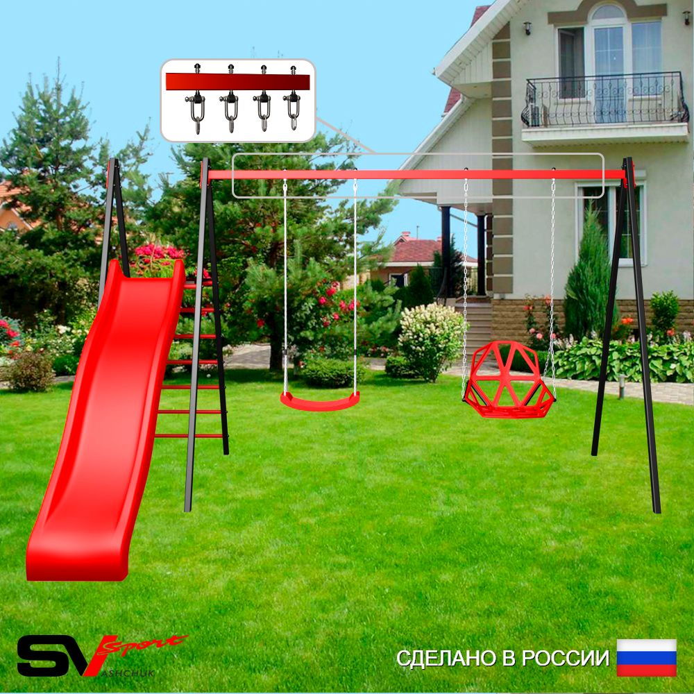 КОМПЛЕКТАЦИЯ: Каркас УК Sv Sport 3.7м, Качели пластиковые "Лодочка", Качели пластиковые со спинкой на цепях, Комплект горка Sv Sport к уличным качелям, Подвесы для качелей на втулке Sv Sport 2 компл.