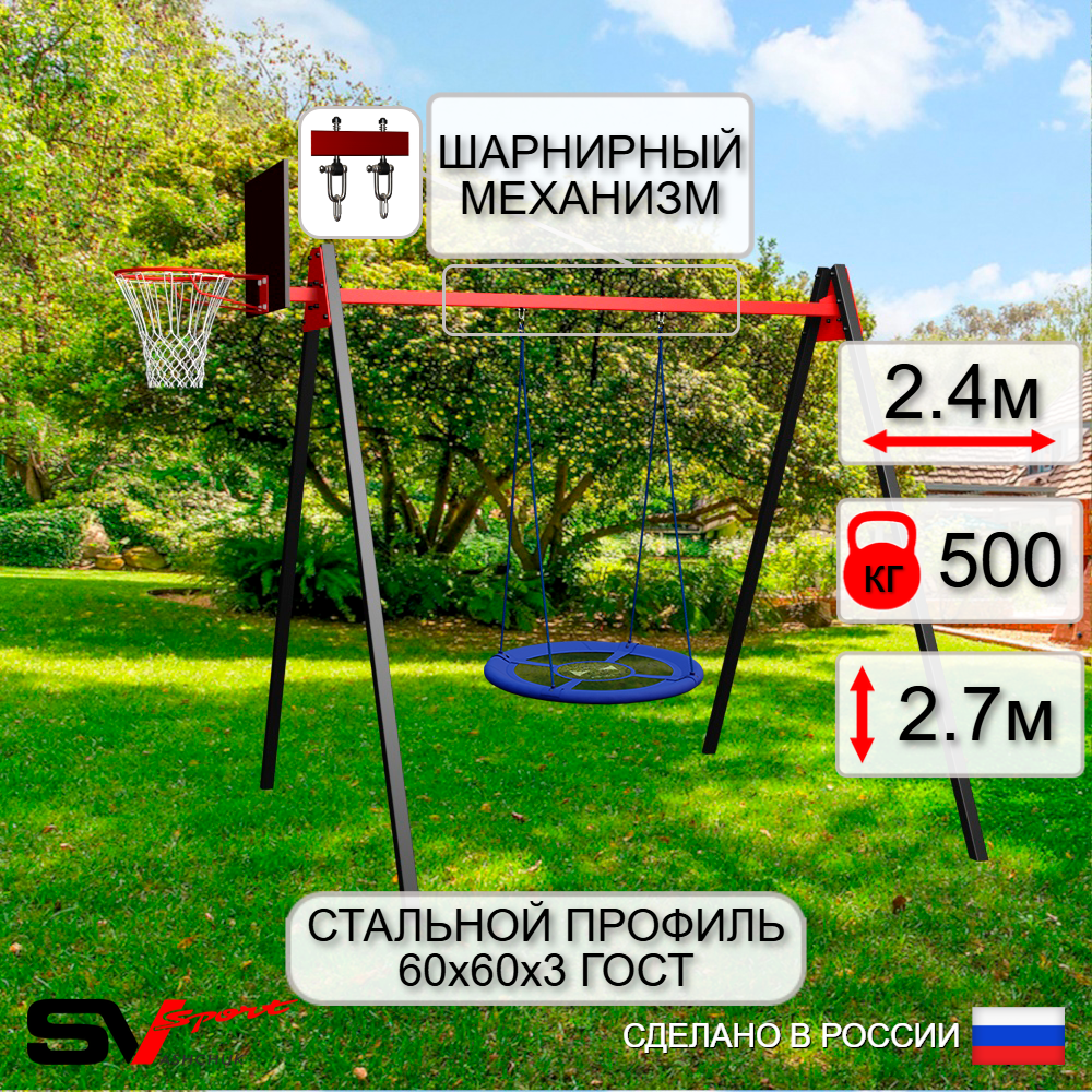КОМПЛЕКТАЦИЯ: Каркас УК Sv Sport Maxi 2.4м, Щит баскетбольный Sv Sport c кронштейном к УК Sv Sport Maхi, Качели - гнездо Оксф. 100см, Подвесы для качелей на втулке Sv Sport 1 компл.