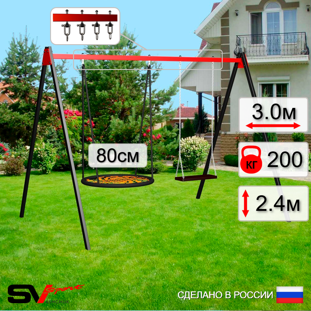 КОМПЛЕКТАЦИЯ: Каркас УК Sv Sport 3.0м, Качели - гнездо 80см, Качели деревянные на цепях Sv Sport, Подвесы для качелей на втулке Sv Sport 2 компл.