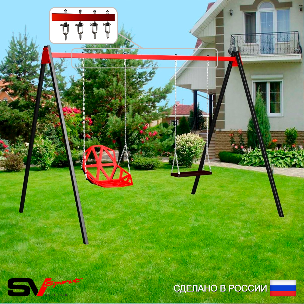 КОМПЛЕКТАЦИЯ: Каркас УК Sv Sport 3.0м, Качели пластиковые со спинкой на цепях, Качели деревянные на цепях Sv Sport, Подвесы для качелей на втулке Sv Sport 2 компл.