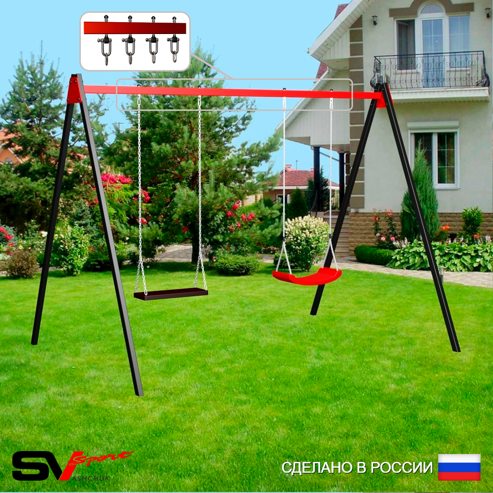Уличные качели Sv Sport (перекладина) изготовлены из профильной трубы 60х40 мм, толщиной 3 мм, (опоры) 2 мм. Крепление перекладины изготовлено из пластины, толщиной 5 мм. Окрашены уличные качели качественной, импортной порошковой краской в 2 слоя, которая устойчива к истиранию и температурным перепадам. Все торцы, болты, гайки заглушены пластиковыми заглушками отличного качества. Использующиеся болты и гайки оцинкованы и соответствуют требованиям ГОСТ. Устанавливаются путем бетонировки на глубину не менее 30 см.