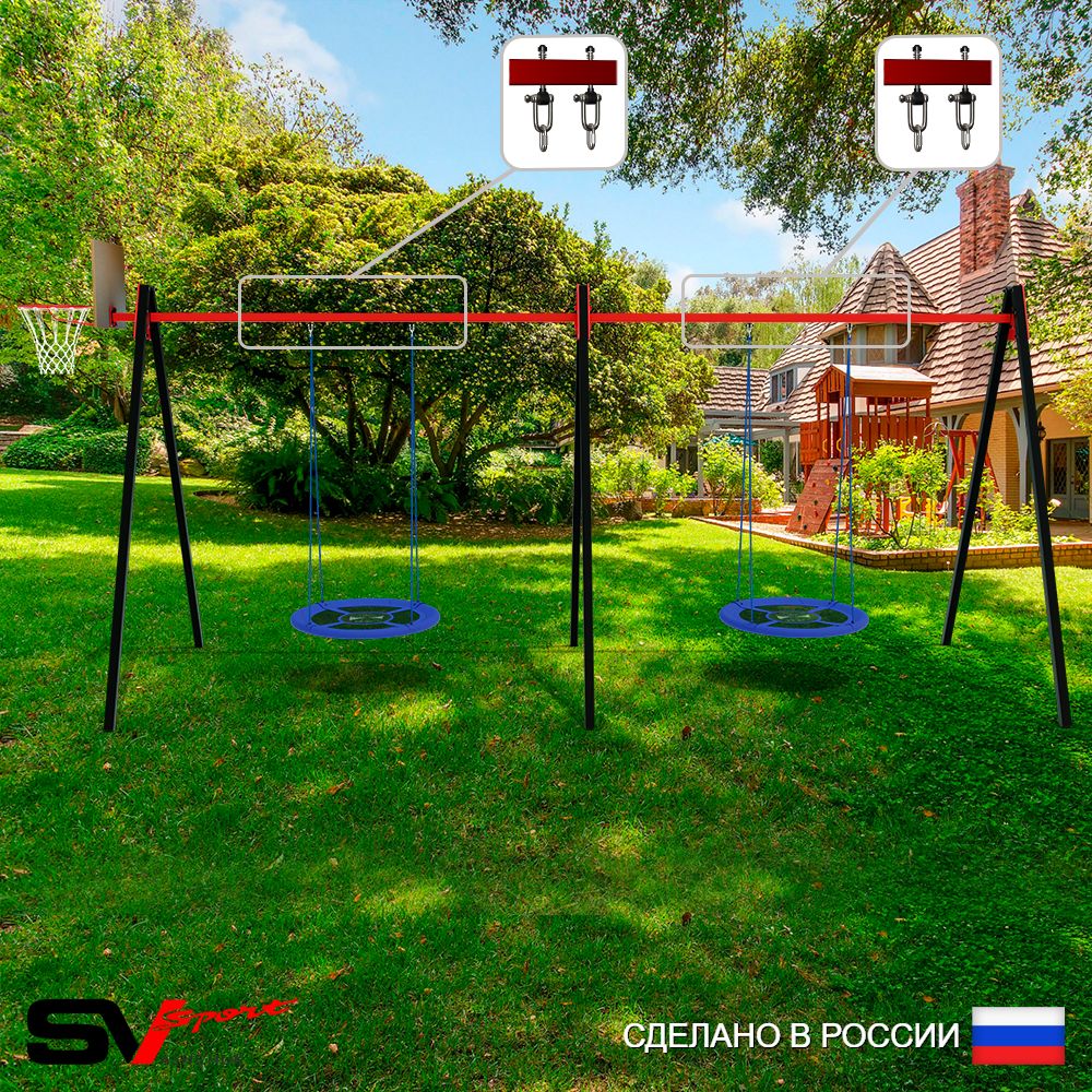 КОМПЛЕКТАЦИЯ: Каркас УК Sv Sport Maxi 4.8м, Щит баскетбольный Sv Sport c кронштейном к УК Sv Sport Maхi, Качели - гнездо Оксф. 100см 2шт, Подвесы для качелей на втулке Sv Sport 2 компл.