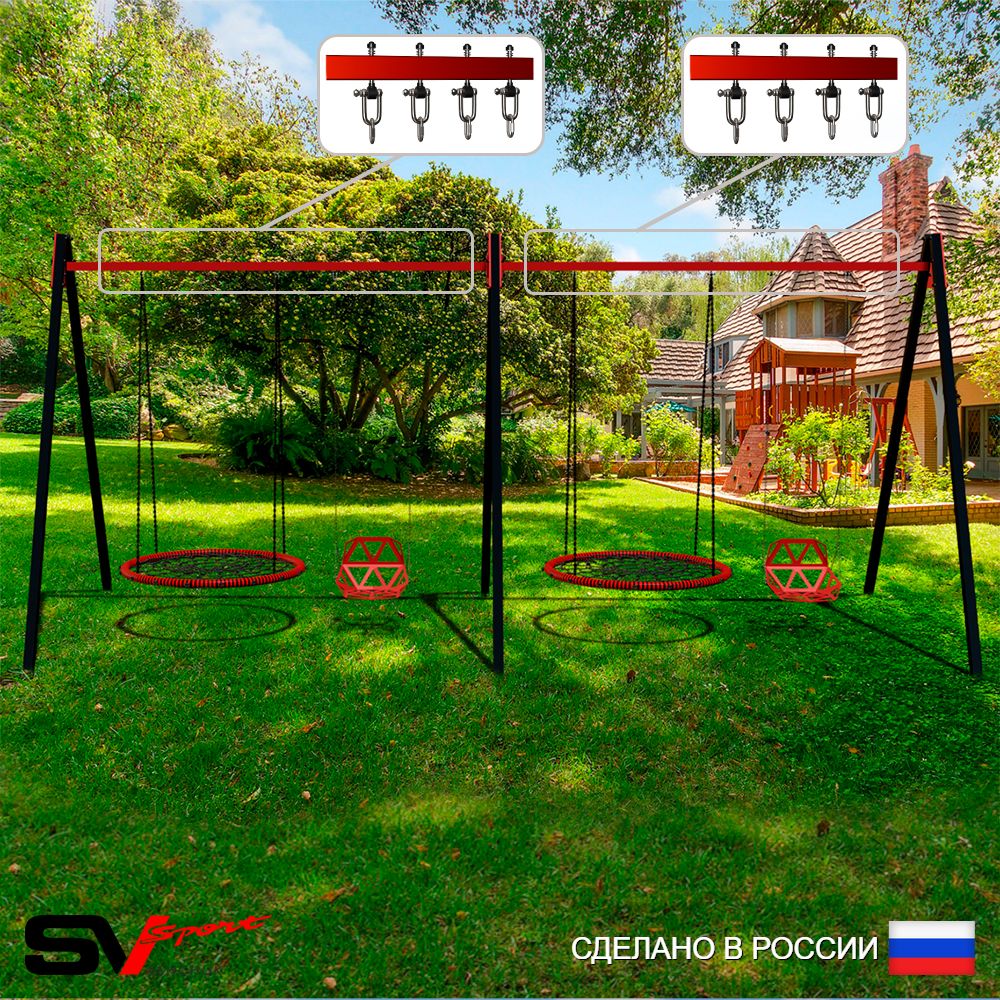 КОМПЛЕКТАЦИЯ: Каркас УК Sv Sport Maxi 4.8м,Качели - гнездо 100см 2шт, Качели пластиковые со спинкой на цепях 2шт, Подвесы для качелей на втулке Sv Sport 4 компл.