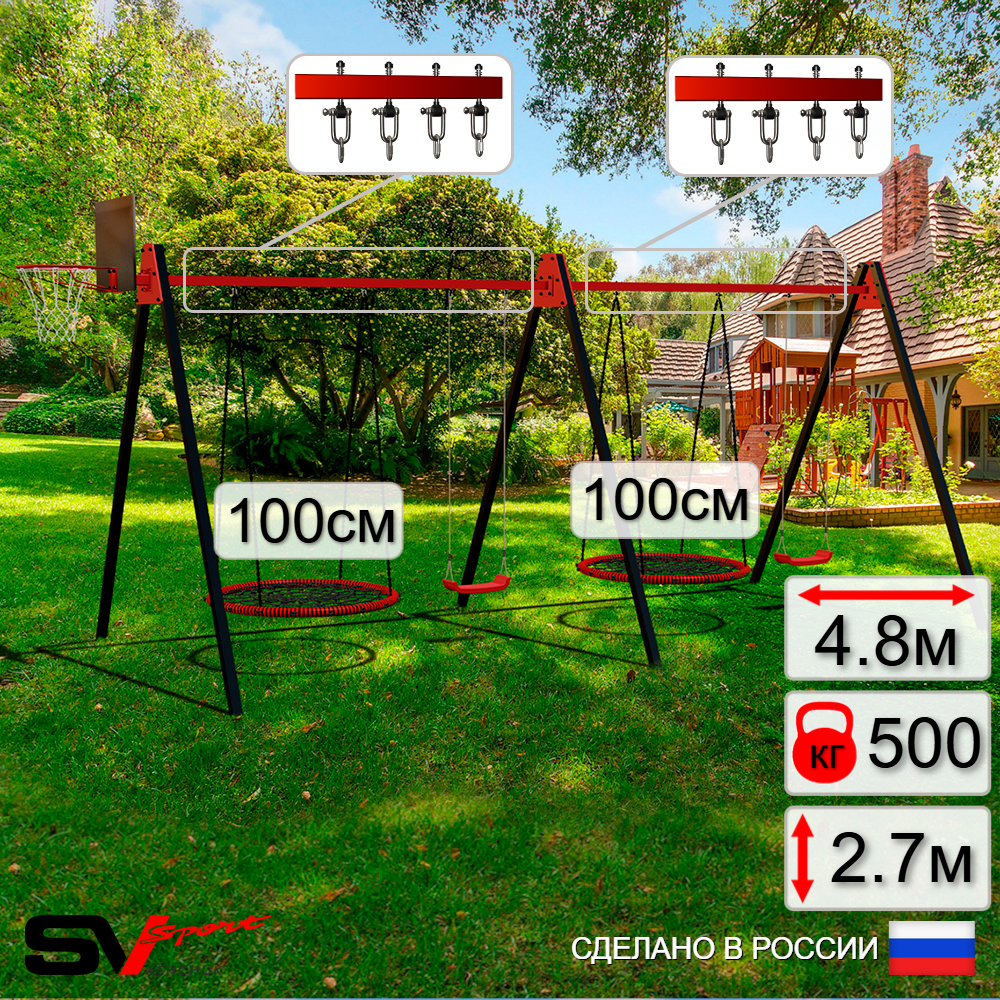 КОМПЛЕКТАЦИЯ: Каркас УК Sv Sport Maxi 4.8м, Щит баскетбольный Sv Sport c кронштейном к УК Sv Sport Maхi,Качели - гнездо 100см 2шт, Качели пластиковые "Лодочка" 2шт, Подвесы для качелей на втулке Sv Sport 4 компл.