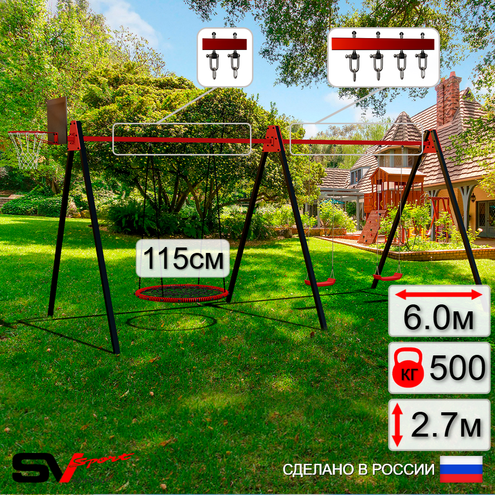 КОМПЛЕКТАЦИЯ: Каркас УК Sv Sport Maxi 6.0м, Щит баскетбольный Sv Sport c кронштейном к УК Sv Sport Maхi, Качели - гнездо 115см, Качели пластиковые "Лодочка" 2шт, Подвесы для качелей на втулке Sv Sport 3 компл.