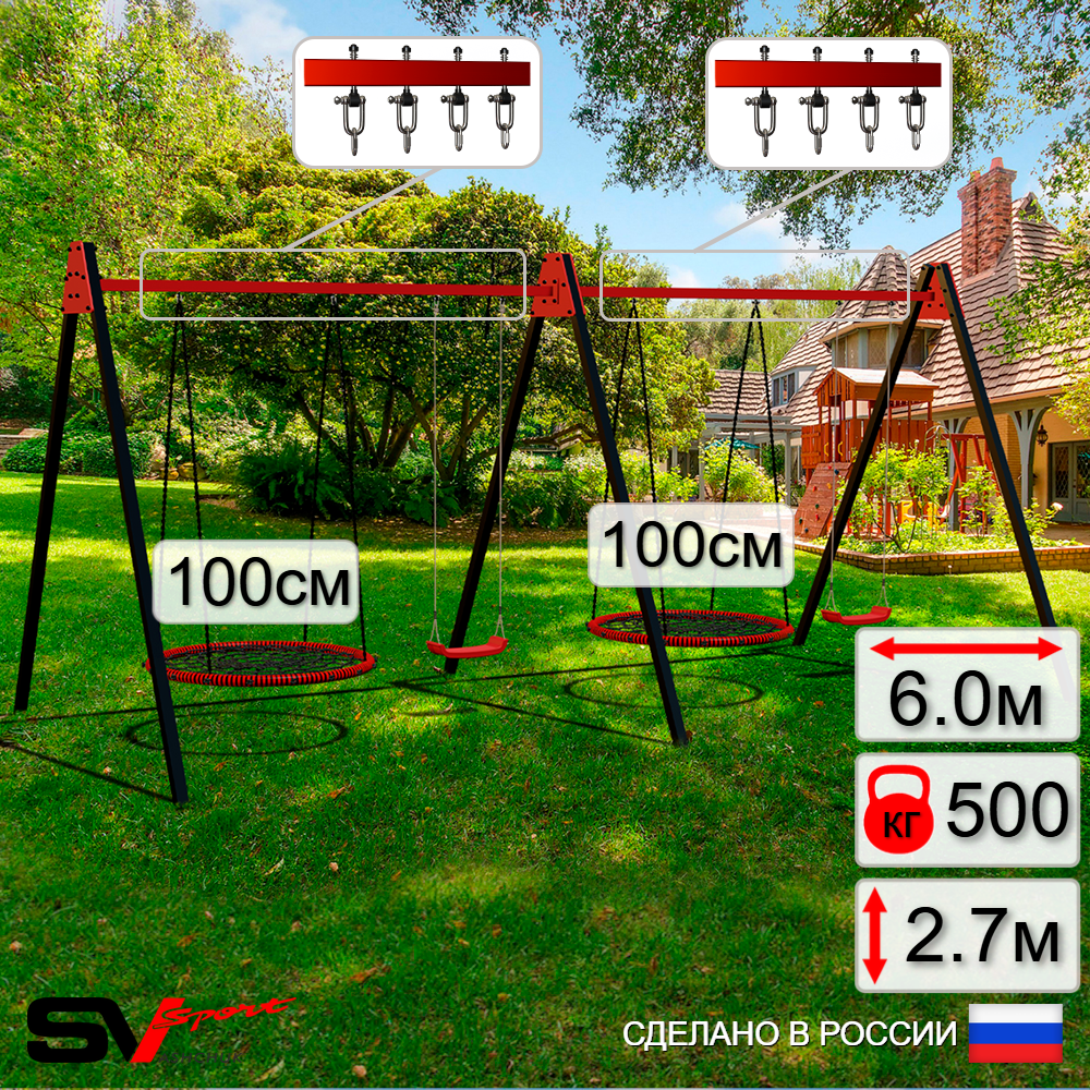 КОМПЛЕКТАЦИЯ: Каркас УК Sv Sport Maxi 6.0м,Качели - гнездо 100см 2шт, Качели пластиковые "Лодочка" 2шт, Подвесы для качелей на втулке Sv Sport 4 компл.