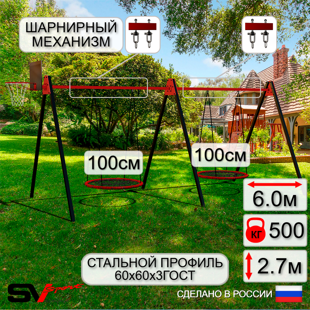 КОМПЛЕКТАЦИЯ: Каркас УК Sv Sport Maxi 6.0м, Щит баскетбольный Sv Sport c кронштейном к УК Sv Sport Maхi,Качели - гнездо 100см 2шт, Подвесы для качелей на втулке Sv Sport 2 компл.